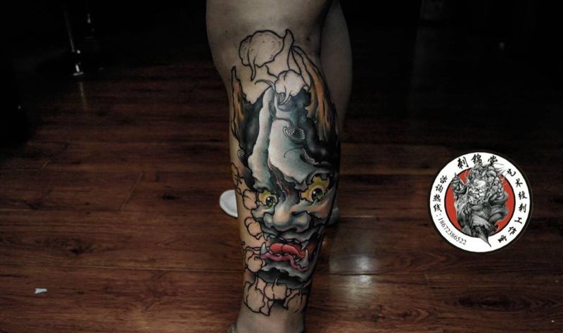 • T包小腿吹火男+阿多福纹身图片_腿部老传统新传统吹火男阿