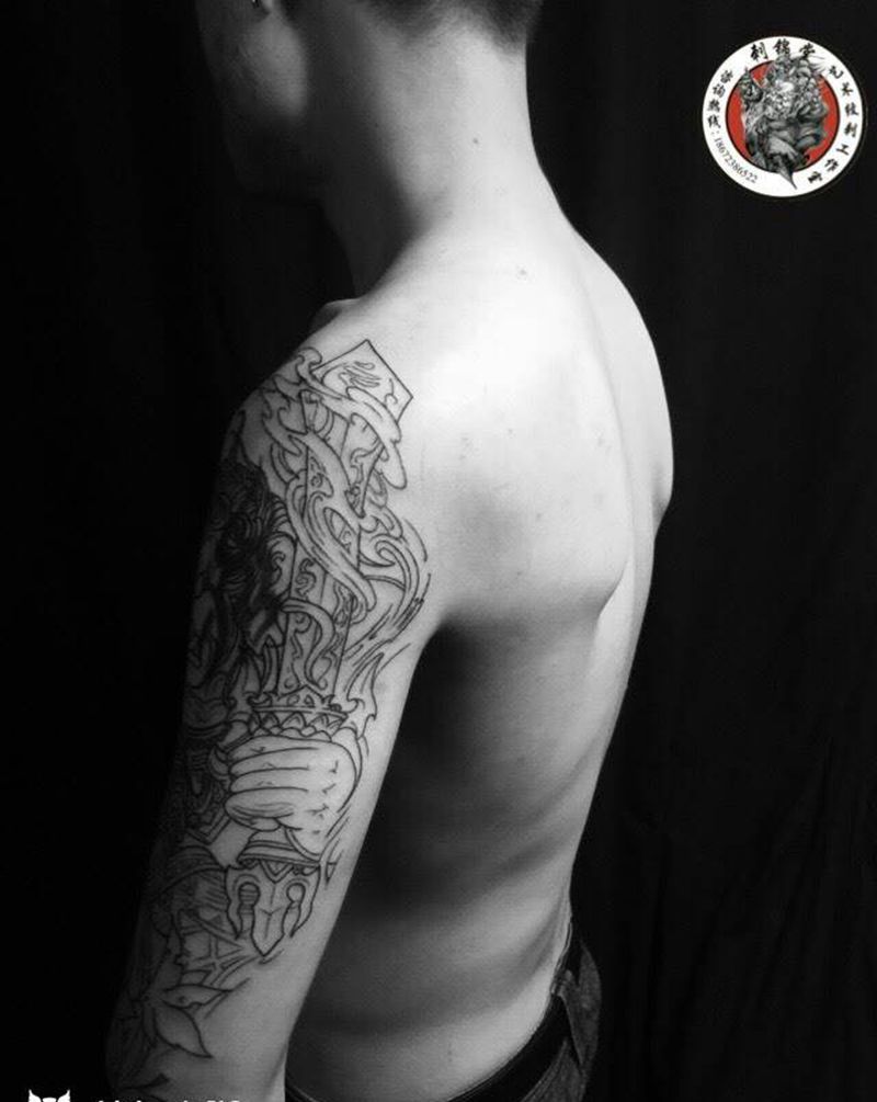 武汉纹身#刺锦堂纹身#作品更新# 八大明王之首不动明王花臂进度中纹身图片