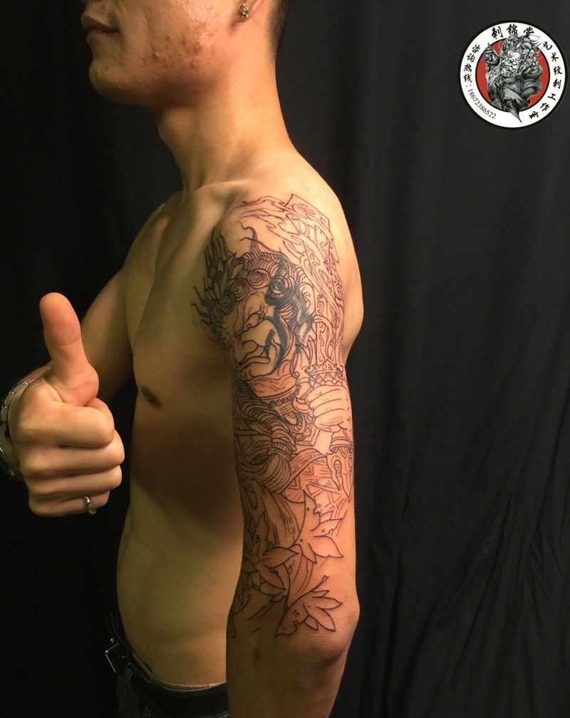 武汉纹身#刺锦堂纹身#作品更新# 八大明王之首不动明王花臂进度中纹身图片