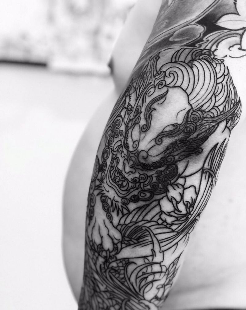 • T网红王老大花腿龙纹身图片_腿部新传统纹身图案