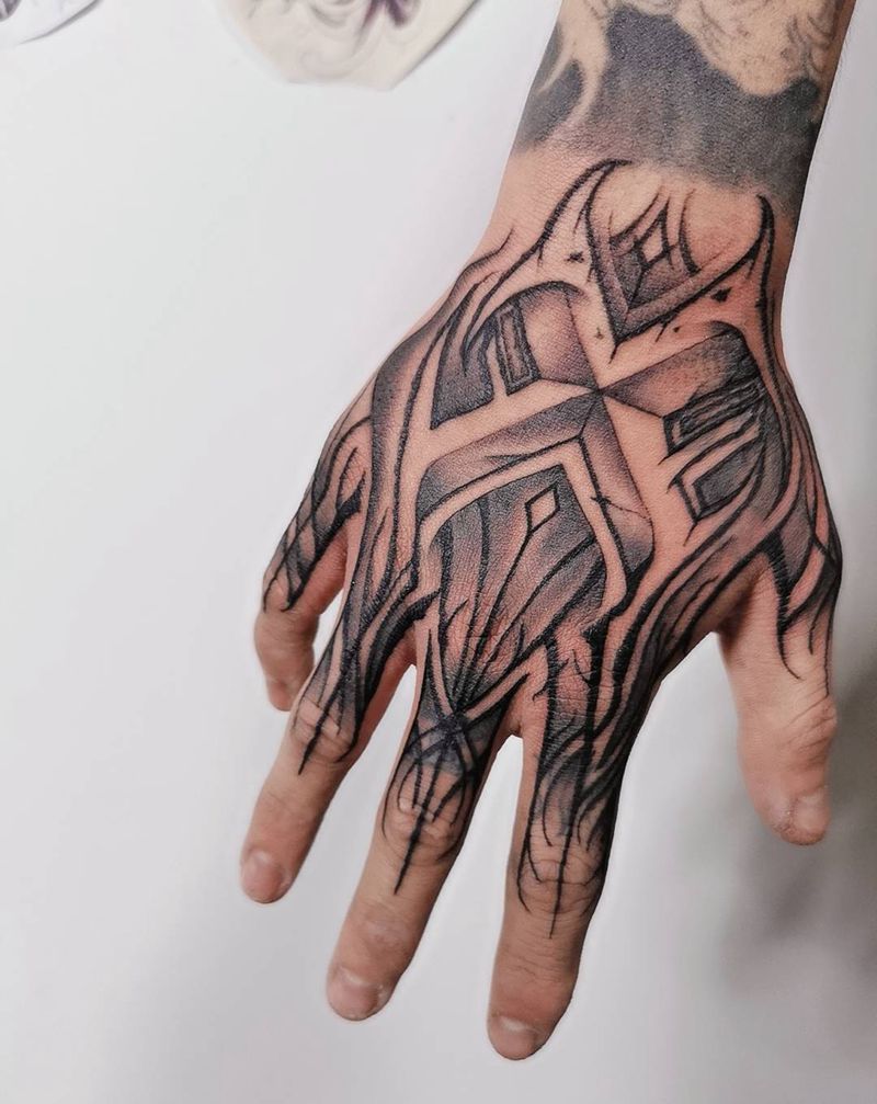 当前位置: 首页 >湖北省武汉市纹身店-释魂刺青纹身图案>暗黑花体字纹身图片_手部图腾花体字纹身图案