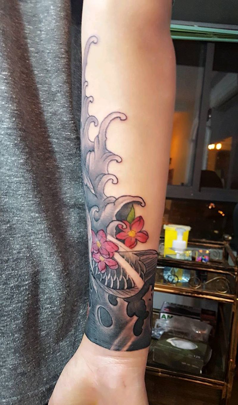 当前位置: 首页 >湖北省武汉市纹身店-释魂刺青纹身图案>鲤鱼遮盖后期上彩色纹身图片
