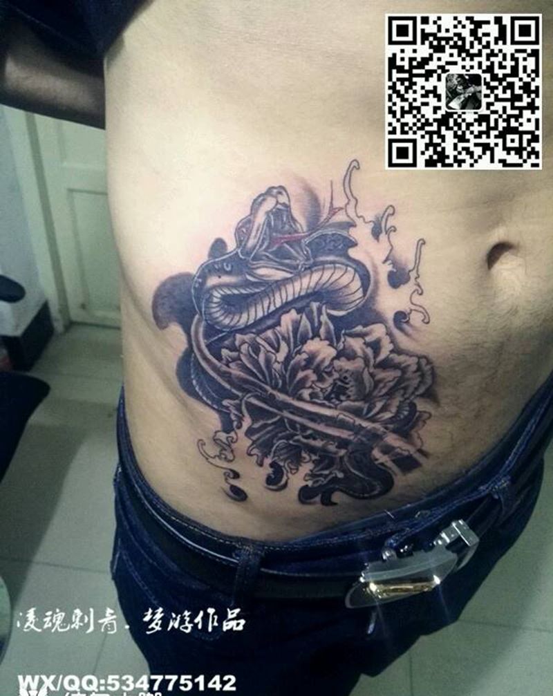 牡丹花蛇纹身图片_腹部传统动物植物成品纹身图案