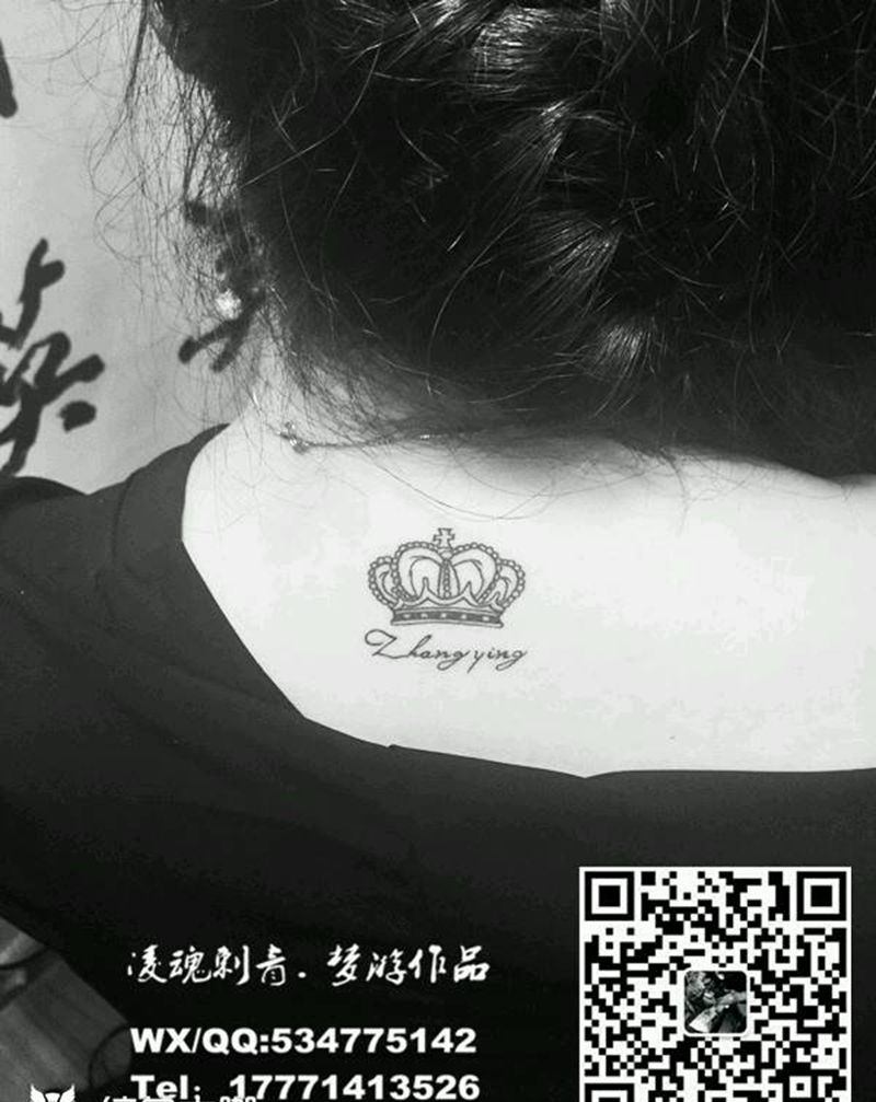 当前位置: 首页 >湖北省武汉市纹身店-武汉惊鸿刺青纹身图案>后颈皇冠配英文纹身图片_颈部清新字符图腾成品纹身图案