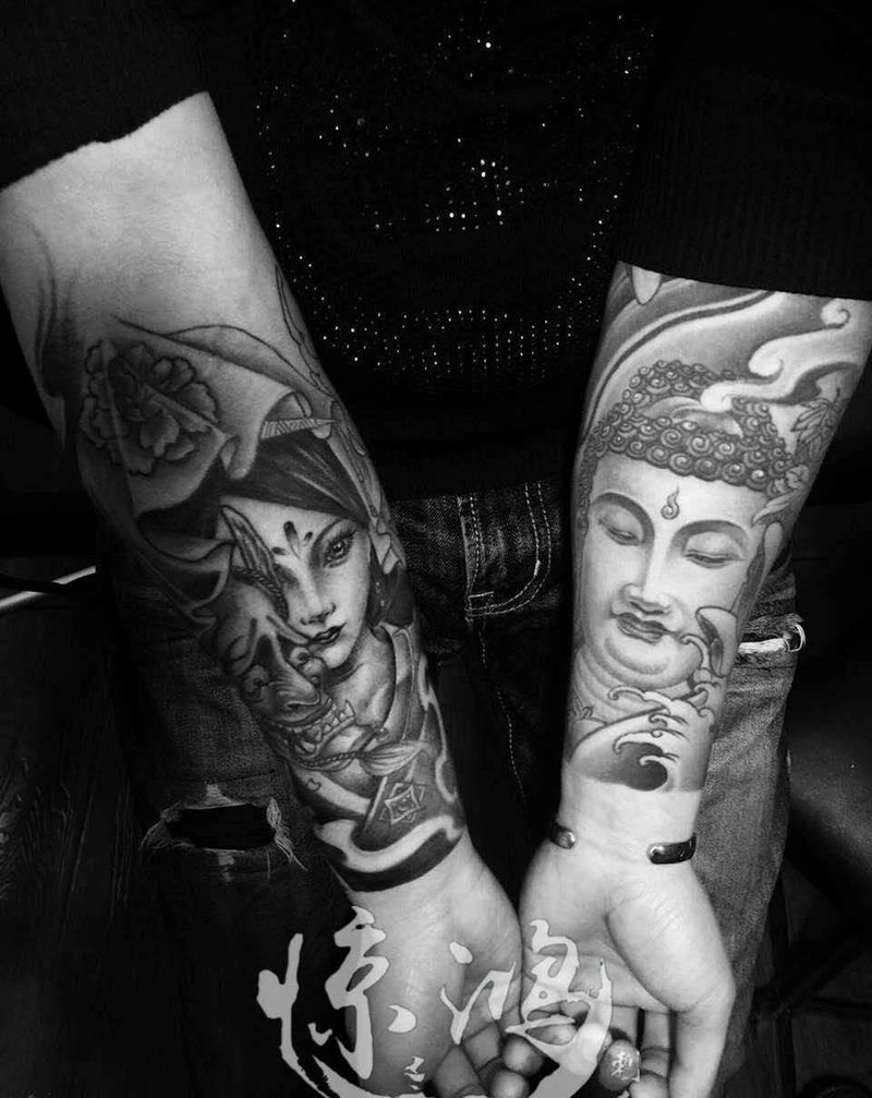 当前位置: 首页 >湖北省武汉市纹身店-武汉惊鸿刺青纹身图案>两只小臂纹身图片_成品手臂传统人物宗教纹身图案