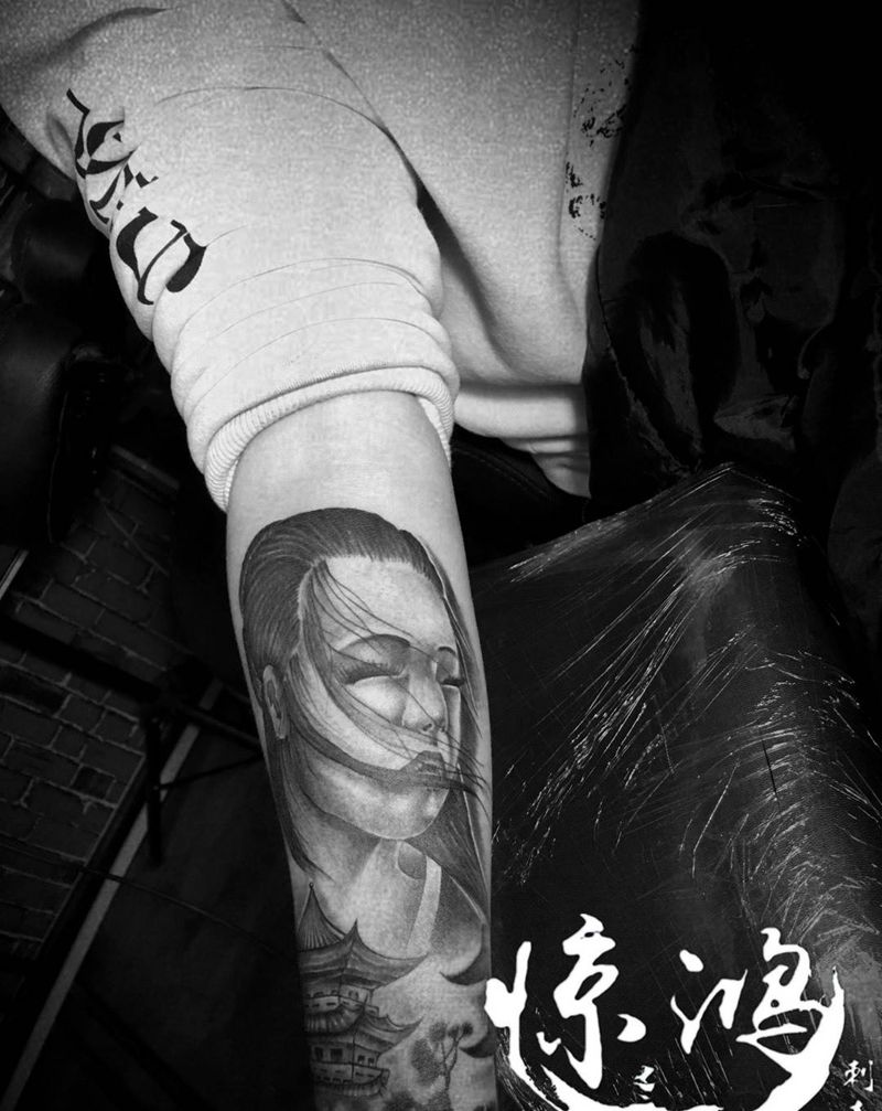 当前位置: 首页 >湖北省武汉市纹身店-武汉惊鸿刺青纹身图案>小臂 艺妓纹身图片_成品手臂肖像写实纹身图案