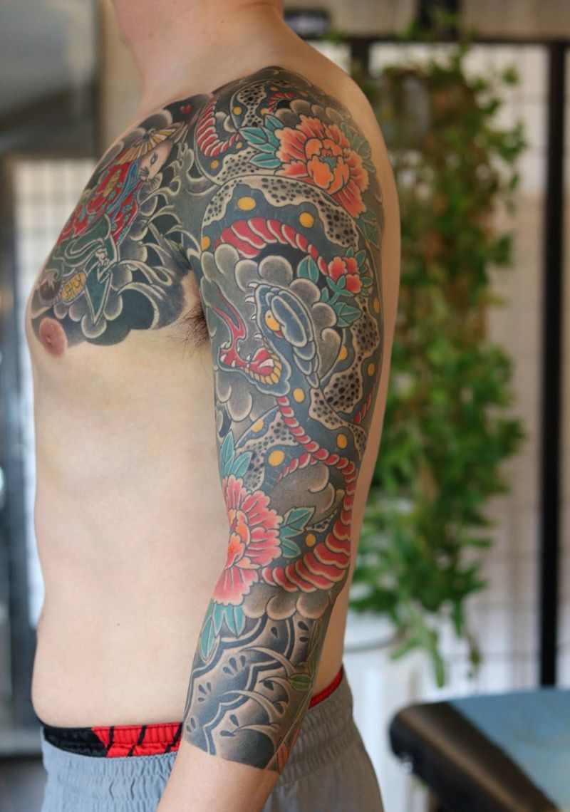 当前位置: 首页 >湖北省襄阳市纹身店-澜墨刺青纹身图案>蛇与牡丹七分袖半胛纹身图片_成品手臂传统植物动物人物原创纹身图案