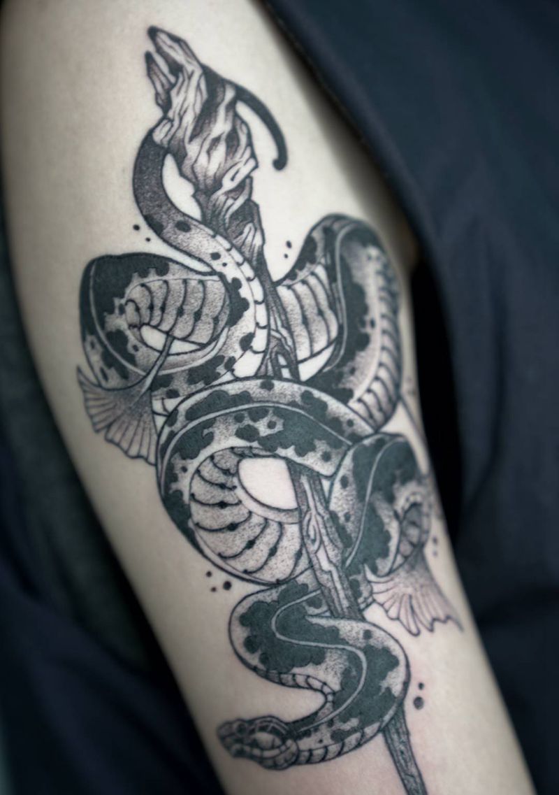 权杖与蛇纹身图片_手部New School纹身图案