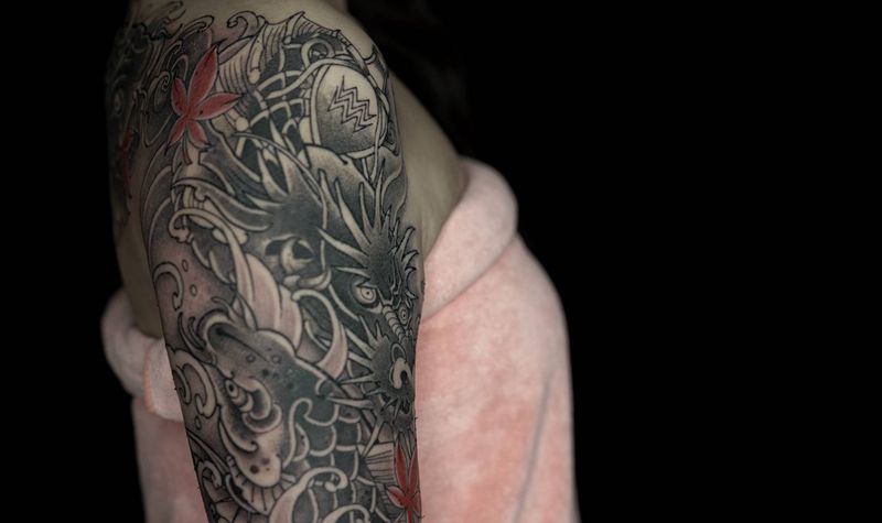 • T网红王老大花腿龙纹身图片_腿部新传统纹身图案