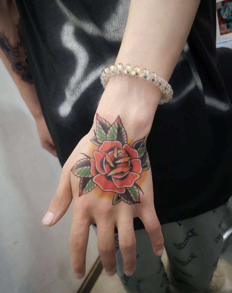 • 手背潮流时尚的玫瑰花眼睛纹身图案