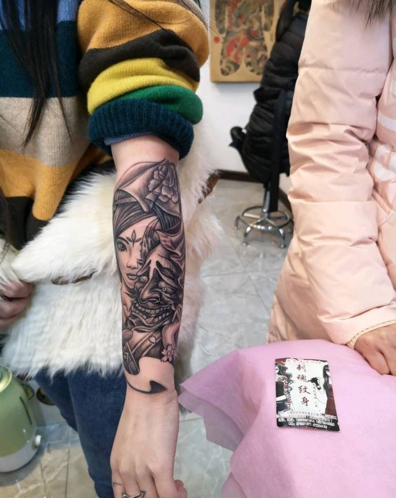 当前位置: 首页 >湖北省十堰市纹身店-刺魂纹身总店纹身图案>艺伎般喏纹身图片_手臂老传统纹身图案