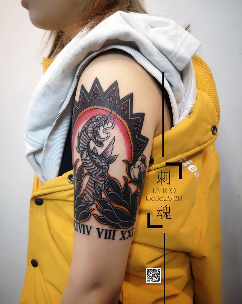 当前位置: 首页 >湖北省十堰市纹身店-刺魂纹身总店纹身图案>蛇 木棉花 烟花纹身图片_手臂Old School纹身图案