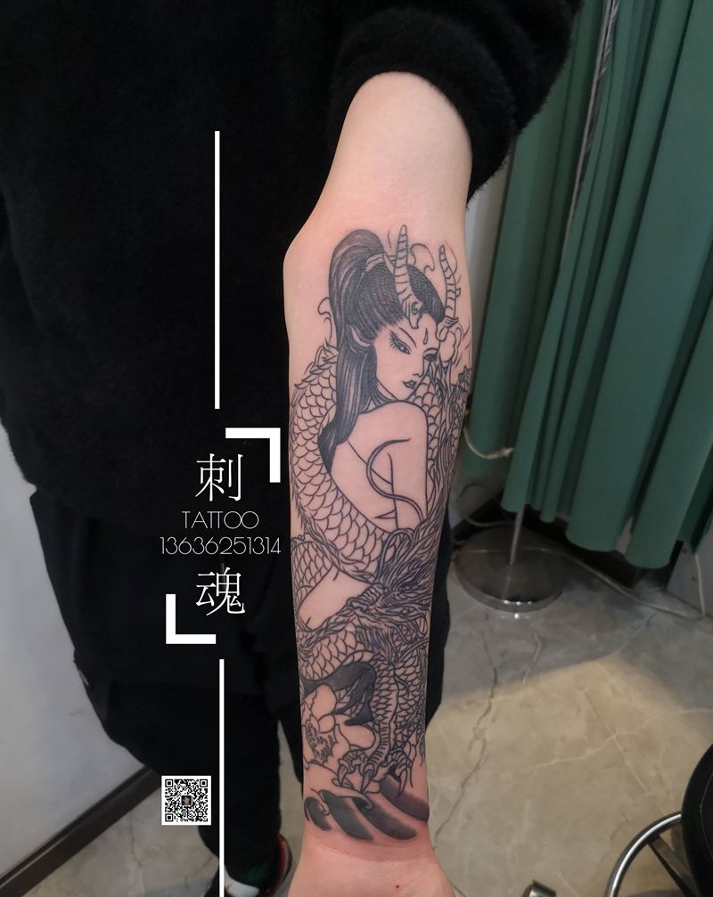 当前位置: 首页 >湖北省十堰市纹身店-刺魂纹身总店纹身图案>龙姬纹身图片_手臂新传统纹身图案