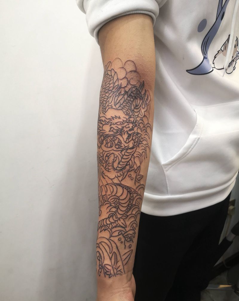当前位置: 首页 >湖北省十堰市纹身店-刺魂纹身总店纹身图案>近期作品纹身图片_手臂新传统纹身图案