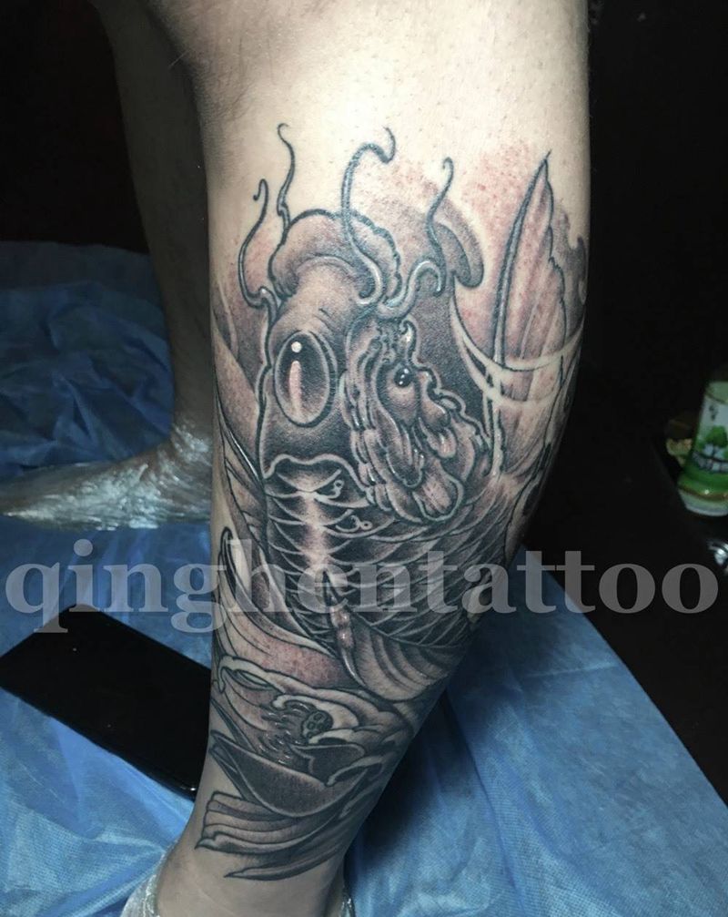 • T网红王老大花腿龙纹身图片_腿部新传统纹身图案