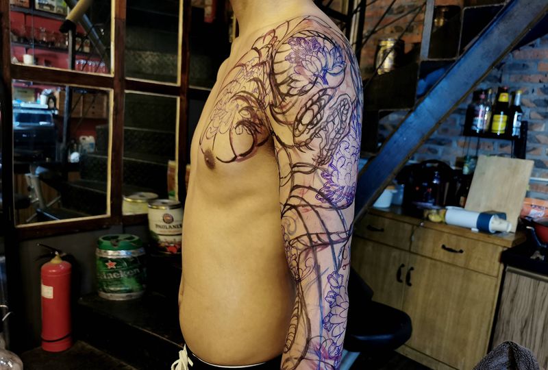 当前位置: 首页 >湖南省长沙市纹身店-长沙小旭纹身纹身图案>七分袖半胛设计纹身图片_手臂老传统花臂长沙长沙学纹身图案