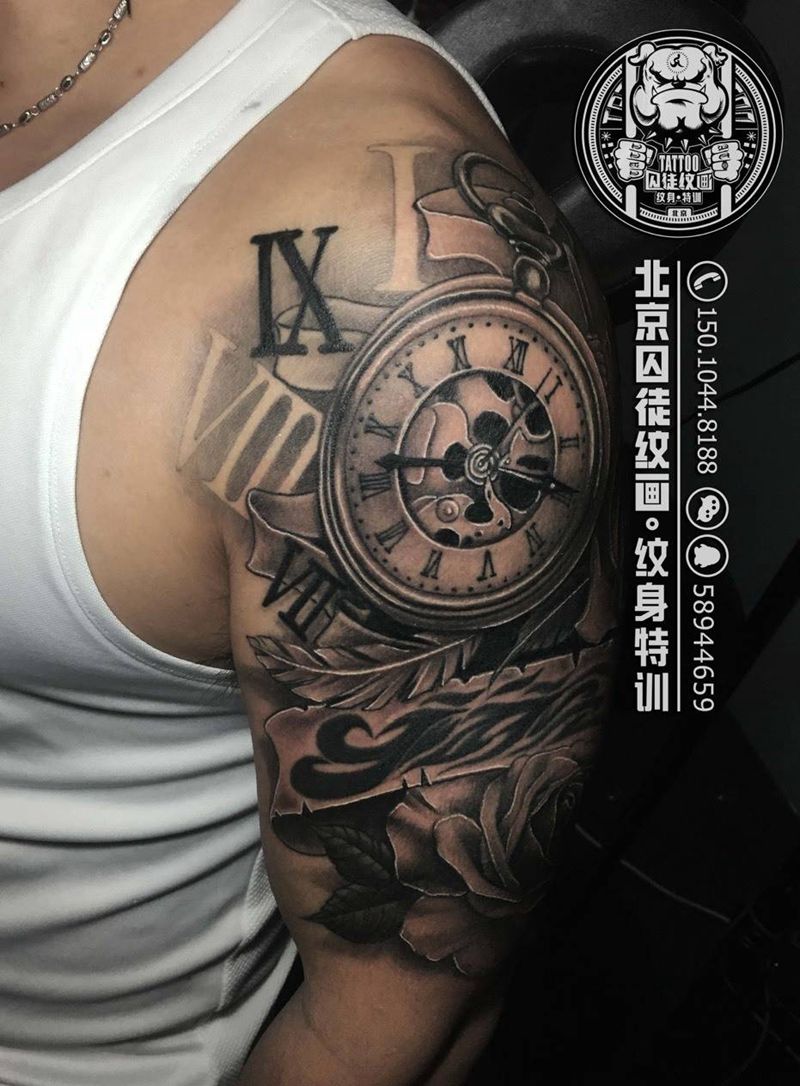 当前位置: 首页 >湖南省长沙市纹身店-长沙小旭纹身纹身图案>钟表玫瑰纹身图片_成品手臂肩部欧美写实植物原创静物纹身图案