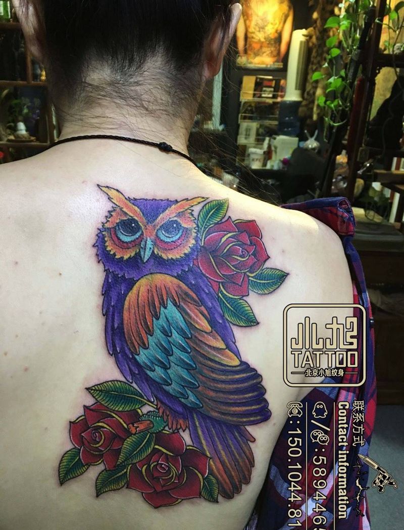 当前位置: 首页 >湖南省长沙市纹身店-长沙小旭纹身纹身图案>猫头鹰纹身图片_成品肩部背部欧美传统动物植物纹身图案