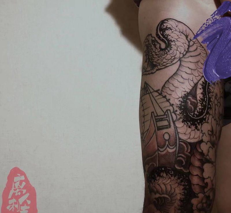• T网红王老大花腿龙纹身图片_腿部新传统纹身图案