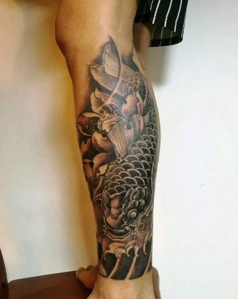 当前位置: 首页 >湖南省长沙市纹身店-木三刺青纹身工作室纹身图案>『荷花 锦鲤』包小腿纹身图片