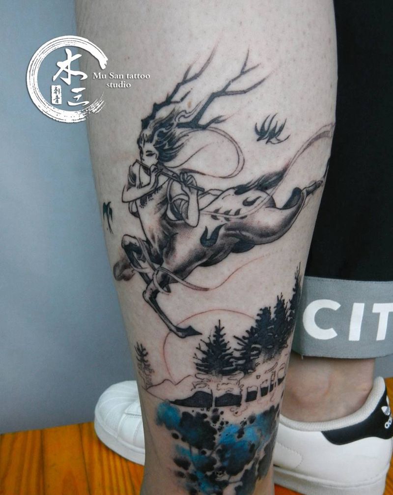 当前位置: 首页 >湖南省长沙市纹身店-木三刺青纹身工作室纹身图案>遮盖完成✅鹿 洛煌笈纹身图片_腿部水墨新传统纹身图案