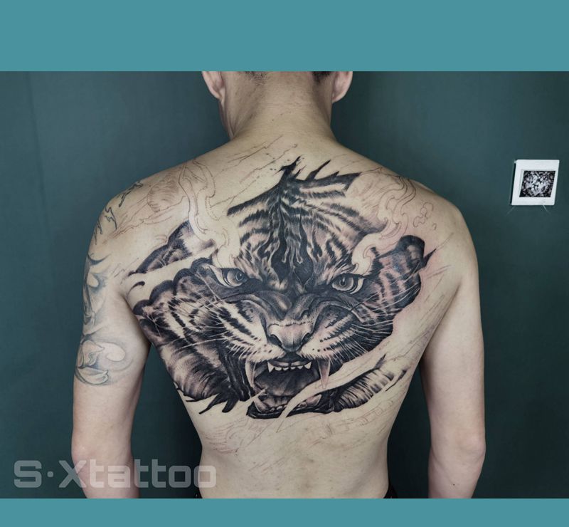 老虎满背 未完纹身图片_欧美写实纹身图案