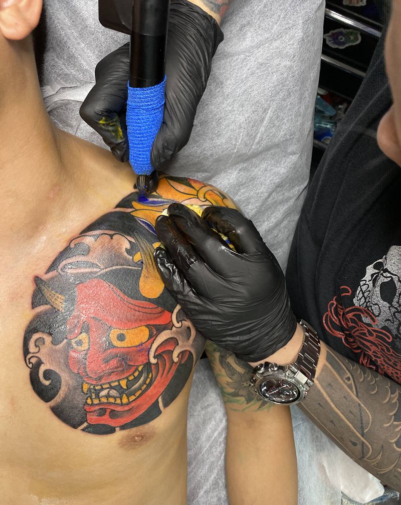 当前位置: 首页 >湖南省长沙市纹身店-长沙彫海刺青工作室纹身图案>半胛- 般若纹身图片_胸部手臂老传统纹身图案