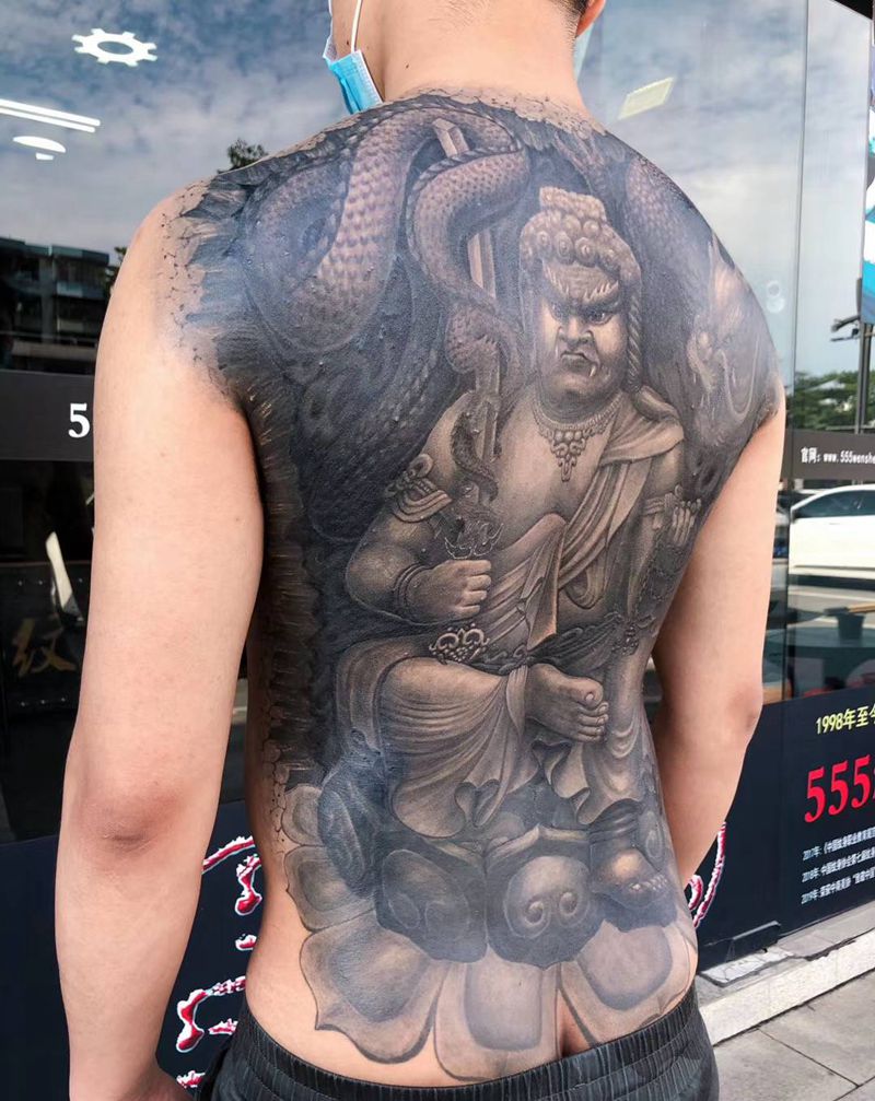 当前位置: 首页 >湖南省长沙市纹身店-555纹身馆(长沙分店)纹身图案>不动冥王(明王)纹身图片_背部腰部新传统欧美写实石雕石裂黑灰写实纹身图案