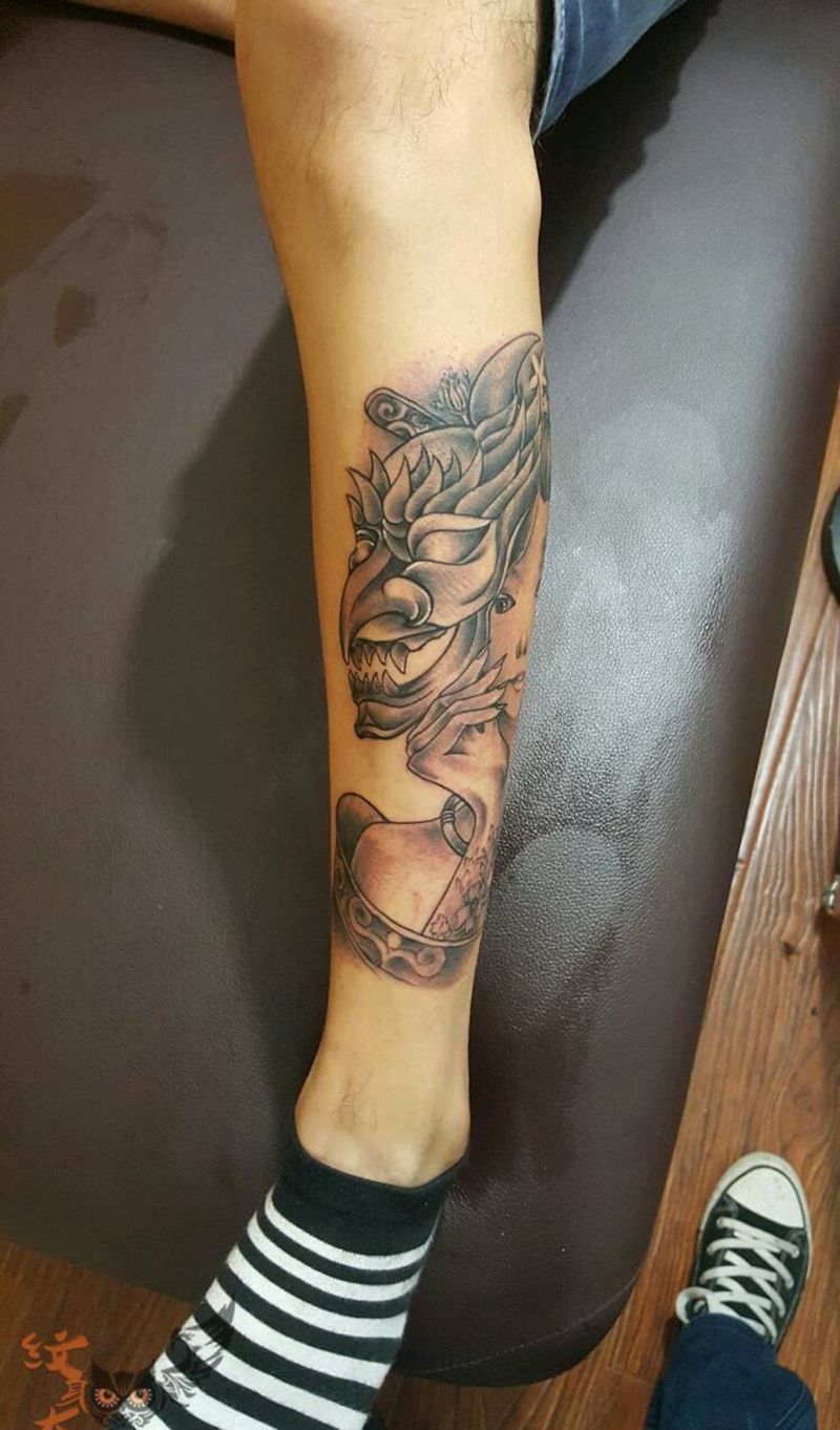 • T包小腿吹火男+阿多福纹身图片_腿部老传统新传统吹火男阿