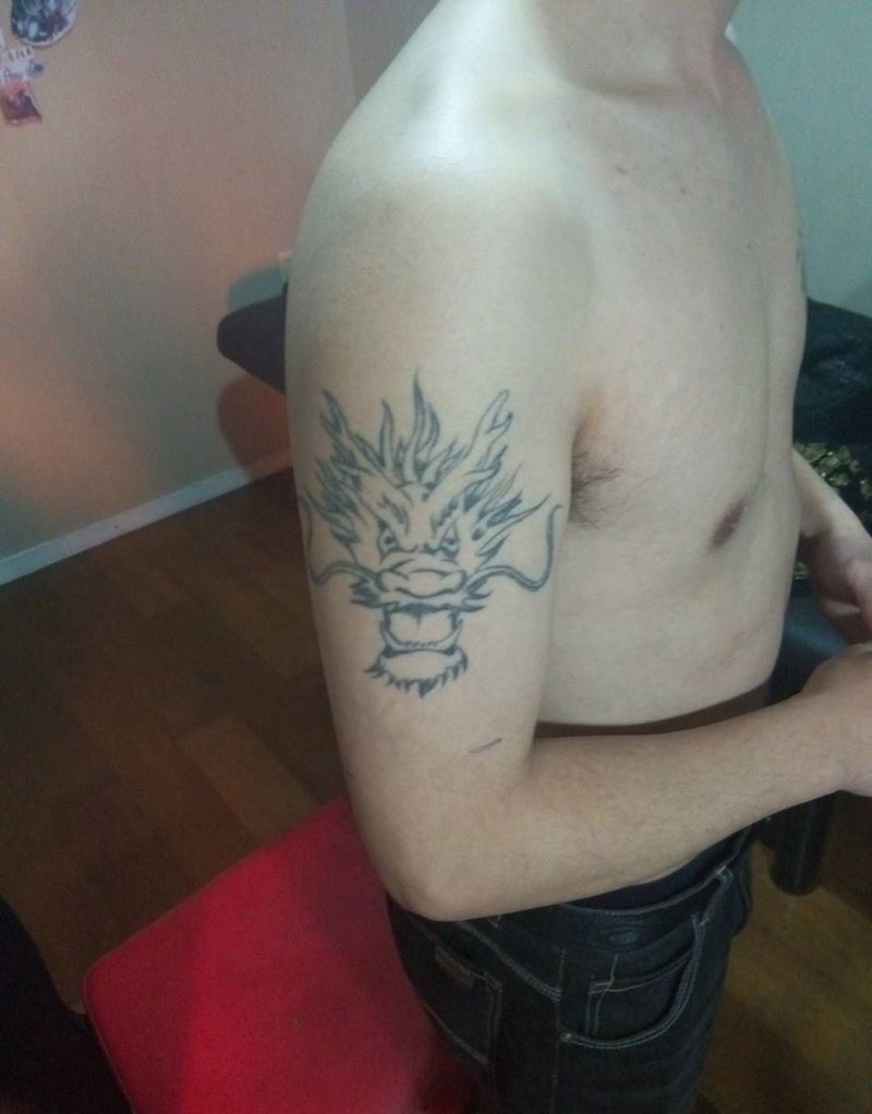 当前位置: 首页 >湖南省长沙市纹身店-长沙玩舍纹身刺青工作室纹身图案>盖盖盖,龙头变唐狮纹身图片_成品手臂传统纹身图案