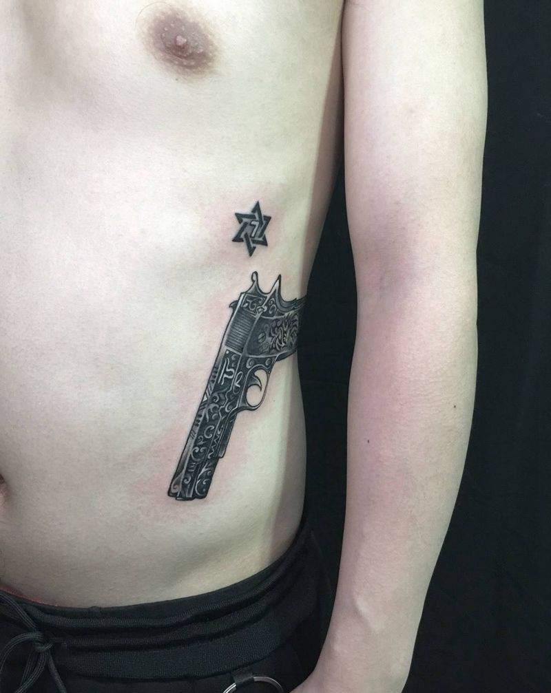 复古纹小手枪,旁边六芒星别人纹的,我帮忙修一纹身图片