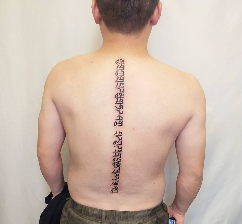 后背脊柱藏文纹身纹身图片_背部纹身图案