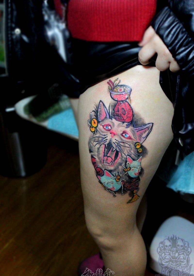 • T网红王老大花腿龙纹身图片_腿部新传统纹身图案