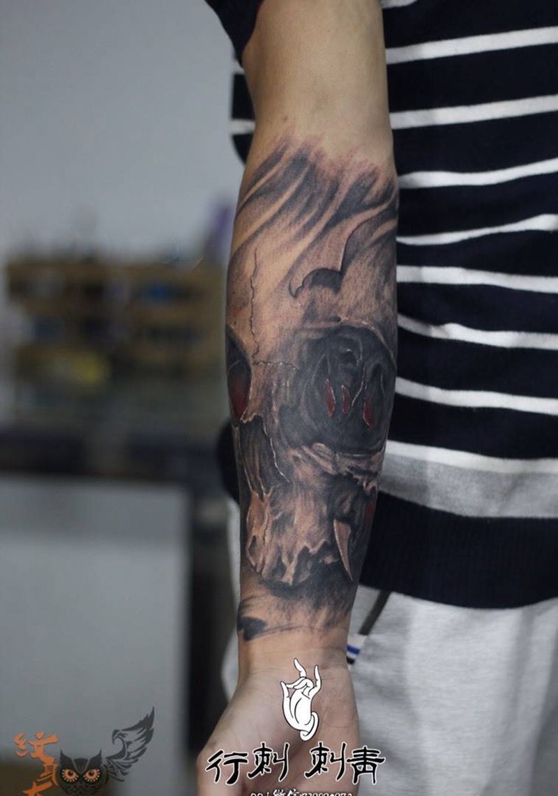 当前位置: 首页 >湖南省长沙市纹身店-长沙行刺刺青纹身图案>骷髅遮盖包小臂纹身图片