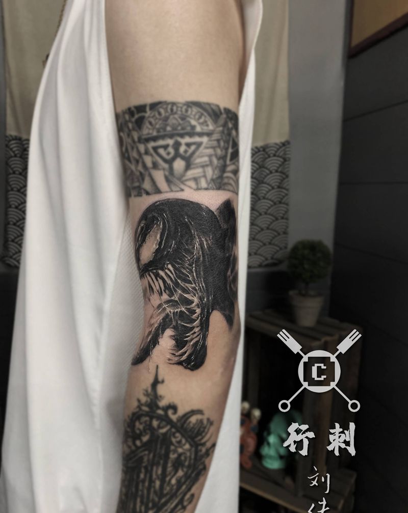当前位置: 首页 >湖南省长沙市纹身店-长沙行刺刺青纹身图案>毒液纹身图片_手臂欧美写实纹身图案