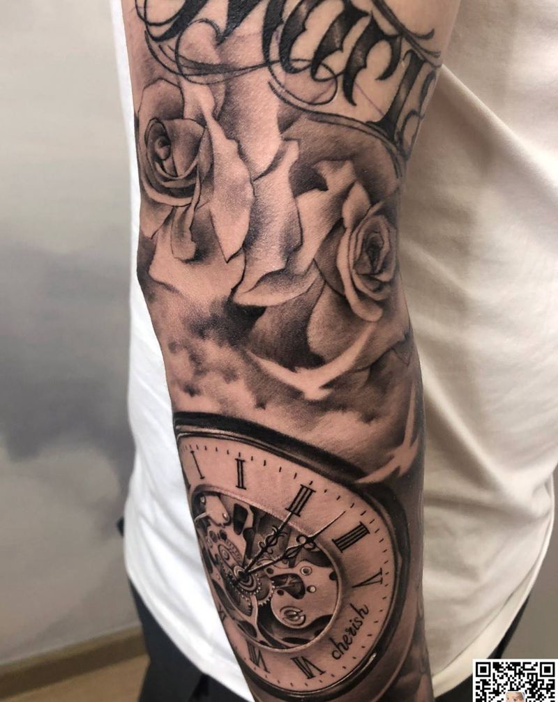 怀表玫瑰纹身图片_手臂欧美写实玫瑰纹身图案