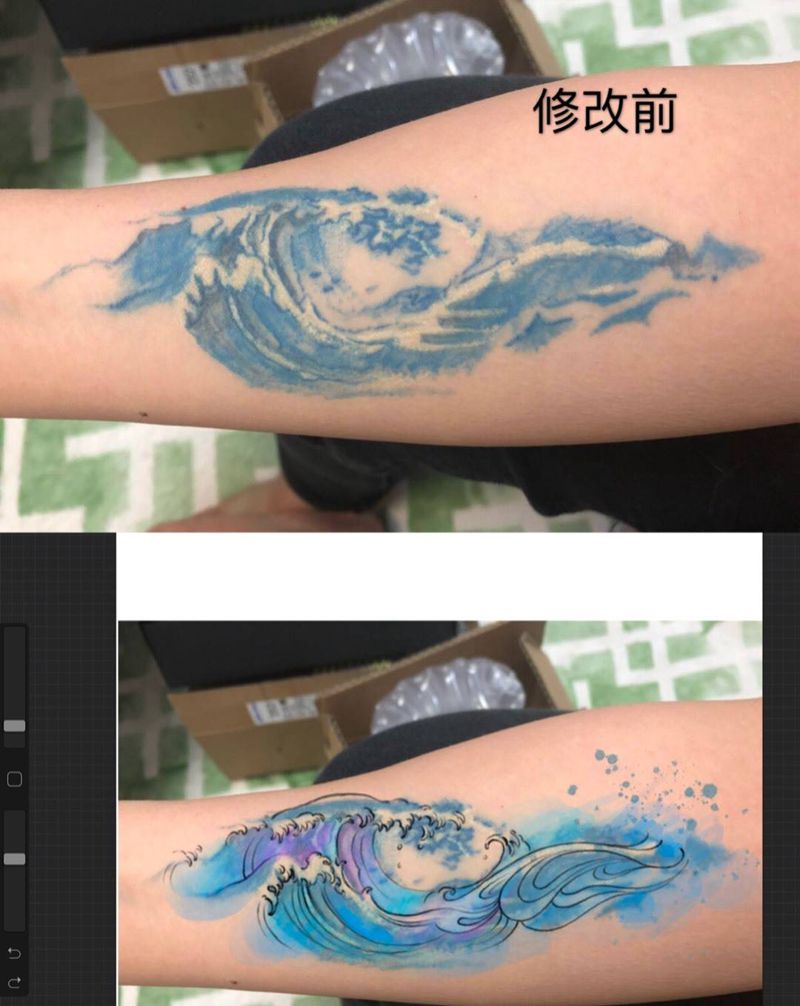 海浪修改纹身图片_手臂水彩海浪纹身图案