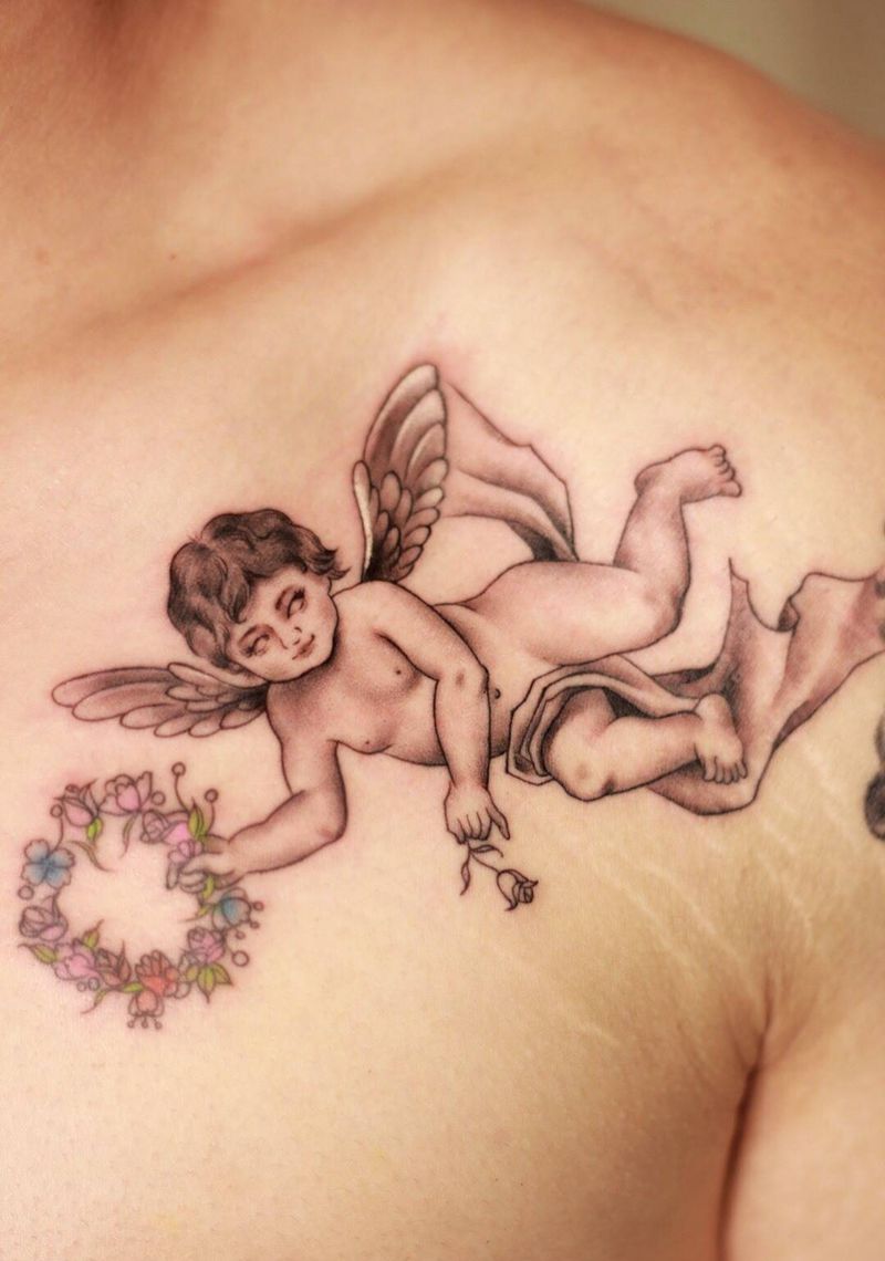 当前位置: 首页 >湖南省长沙市纹身店-深白刺青纹身图案>小天使花肩纹身图片_肩部欧美写实天使纹身图案