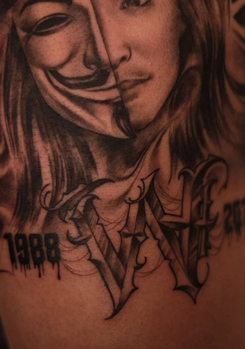 V字仇杀队设计肖像纹身图片_手臂欧美写实V字仇杀队纹身图案
