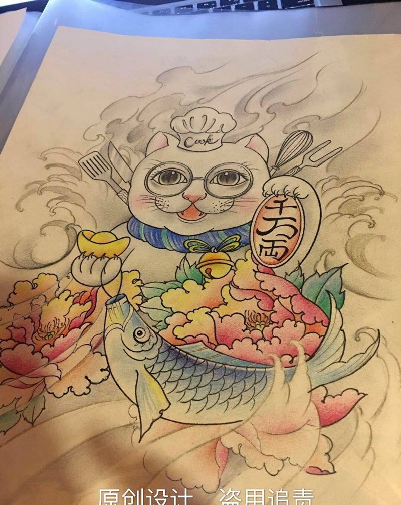 原创招财猫纹身图片_手臂New School招财猫纹身图案