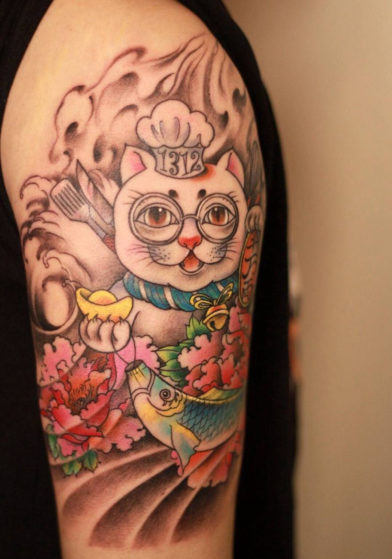 原创招财猫纹身图片_手臂New School招财猫纹身图案