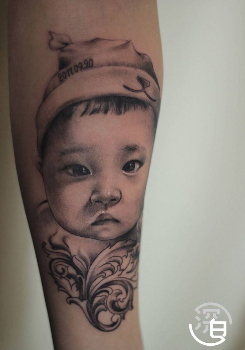 亚洲宝宝肖像纹身图片_手臂手部欧美写实图腾肖像纹身图案