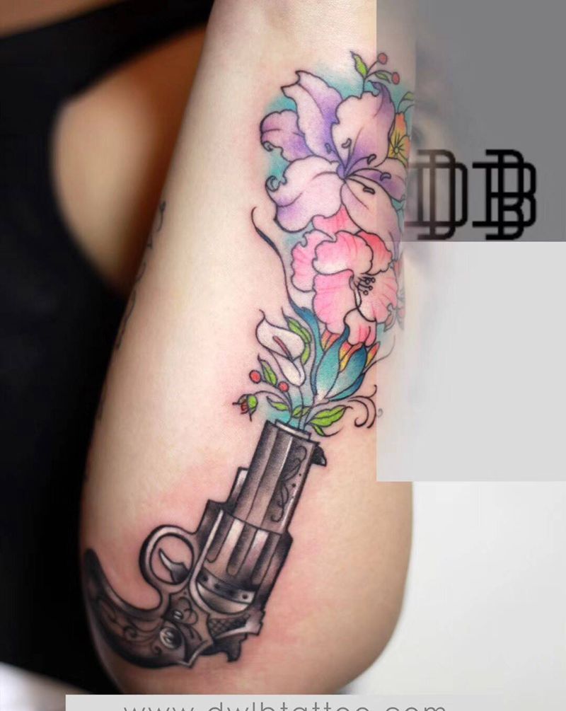 小清新花枪纹身图片_手臂手部欧美写实New School枪纹身图案
