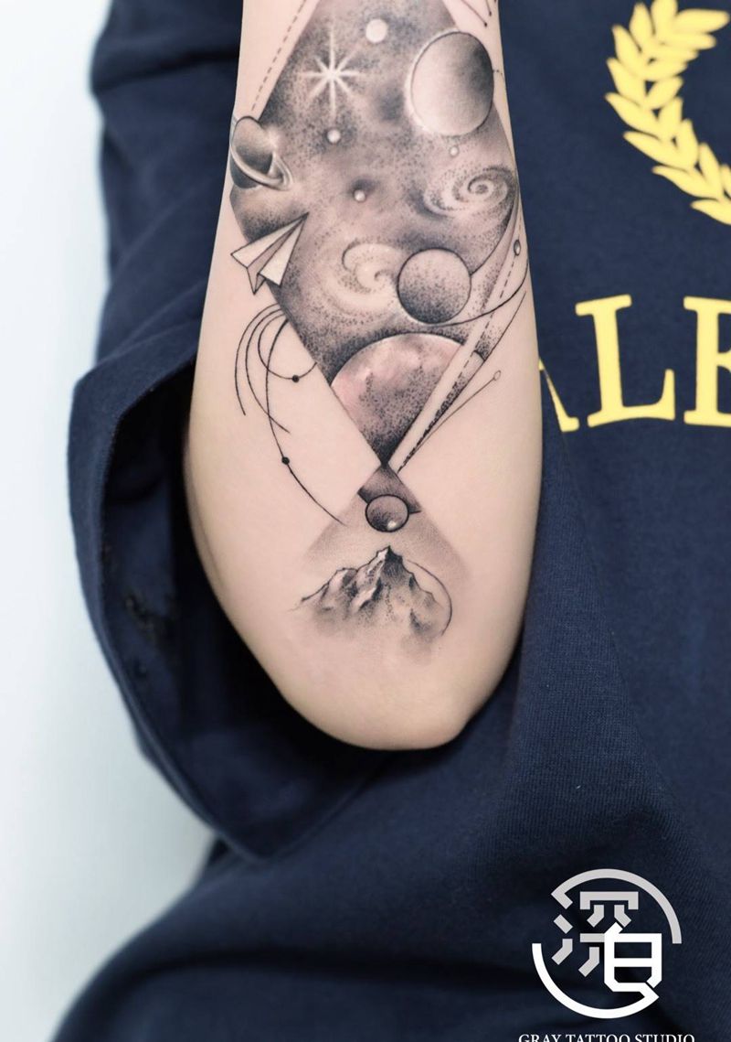 当前位置: 首页 >湖南省长沙市纹身店-深白刺青纹身图案>宇宙与山纹身图片_手臂手部欧美写实点刺宇宙星球纹身图案