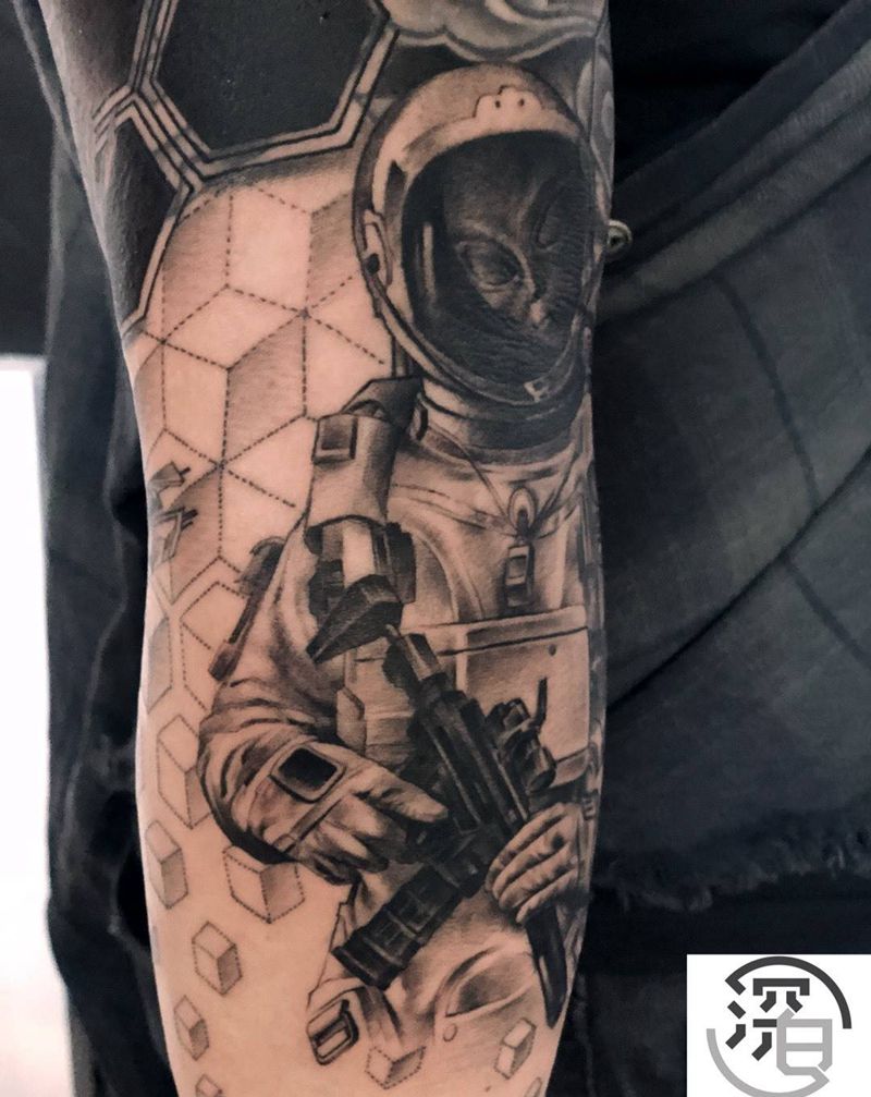 当前位置: 首页 >湖南省长沙市纹身店-深白刺青纹身图案>概念版星球大战纹身图片_手臂手部欧美写实太空人纹身图案