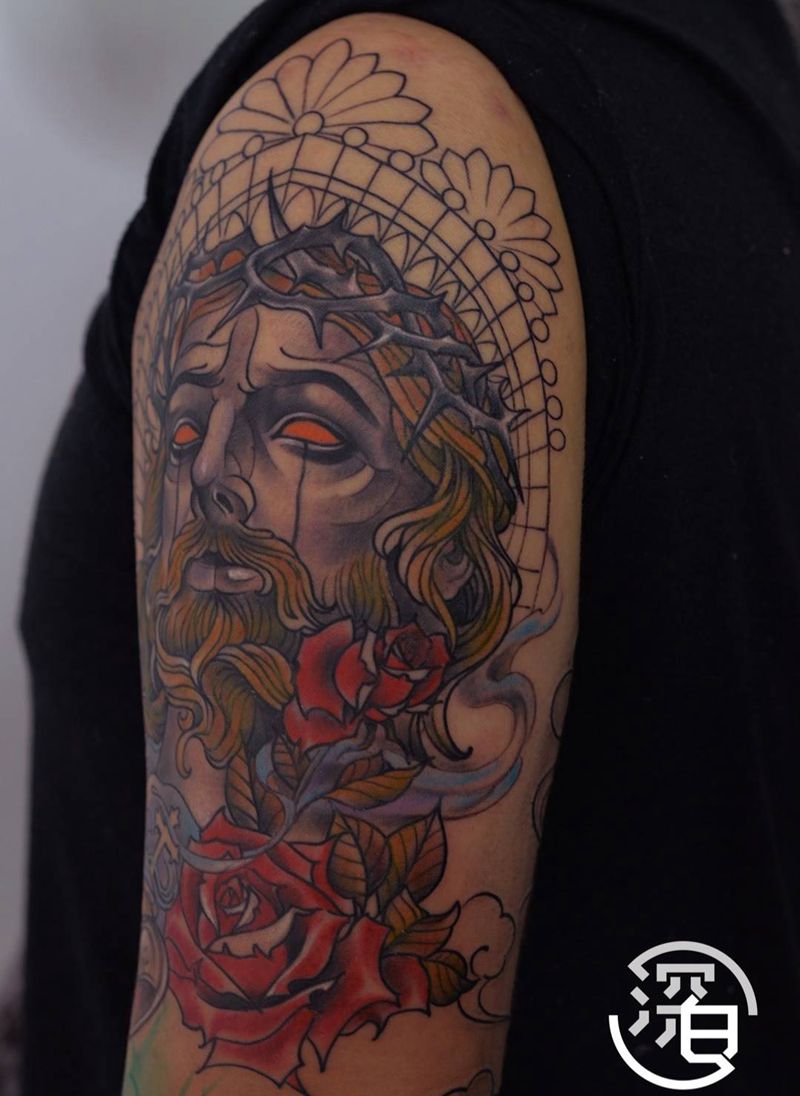 当前位置: 首页 >湖南省长沙市纹身店-深白刺青纹身图案>耶稣纹身图片_手臂手部New School耶稣纹身图案