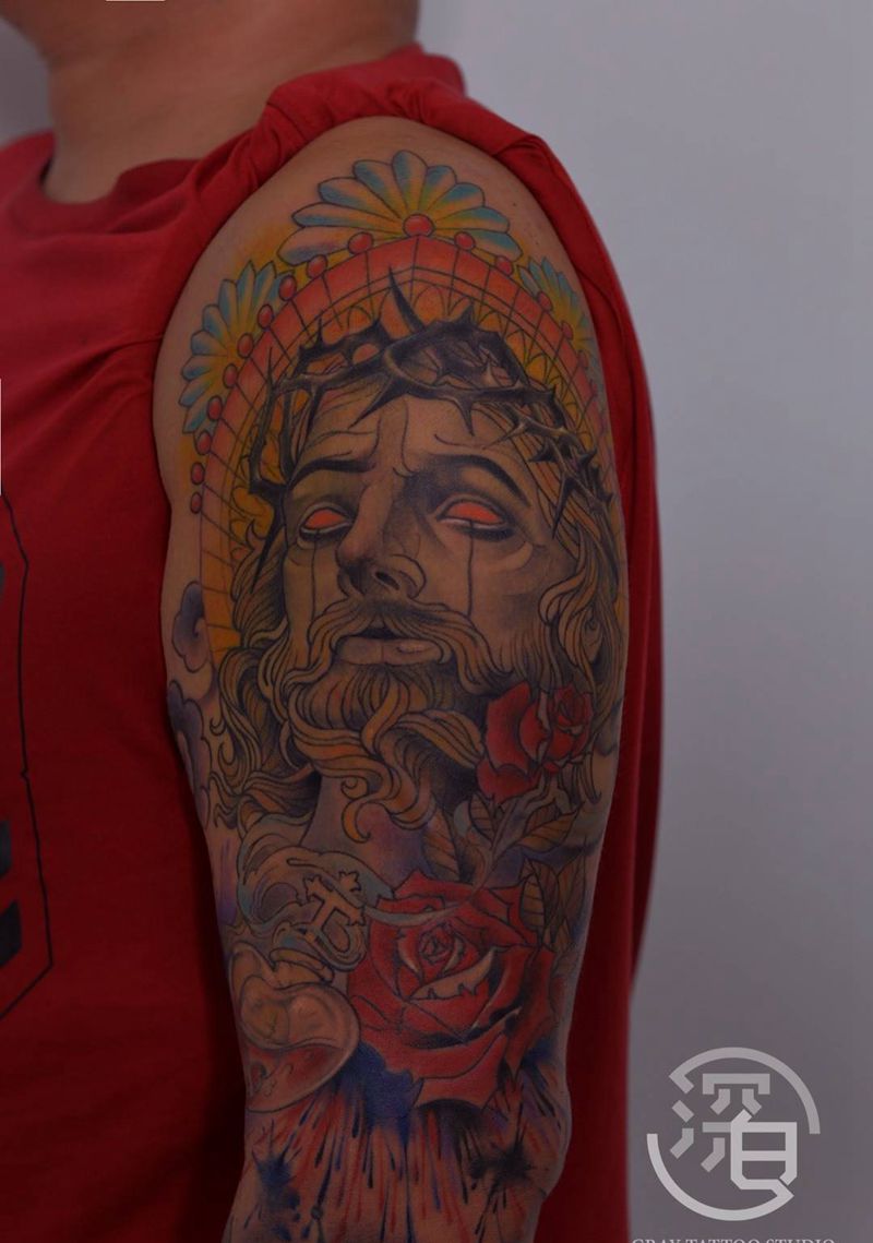 当前位置: 首页 >湖南省长沙市纹身店-深白刺青纹身图案>耶稣纹身图片_手臂手部New School耶稣纹身图案