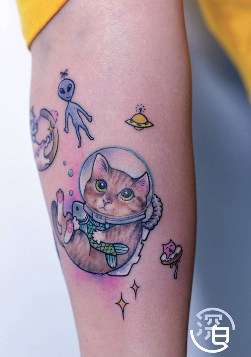 当前位置: 首页 >湖南省长沙市纹身店-深白刺青纹身图案>宠物肖像设计纹身图片_手臂手部欧美写实New School猫纹身图案