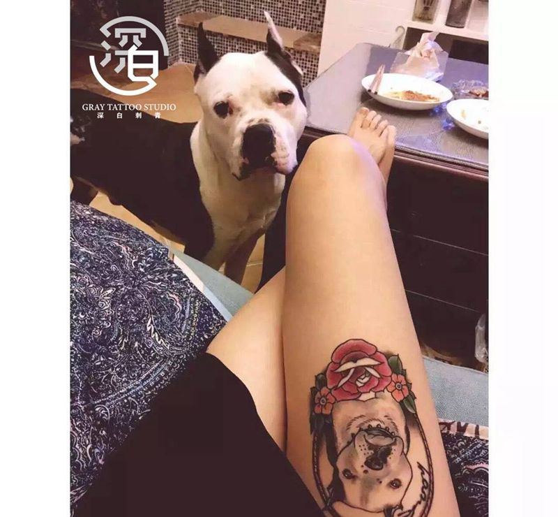 当前位置: 首页 >湖南省长沙市纹身店-深白刺青纹身图案>原创宠物肖像纹身图片_脚部腿部欧美写实New School狗纹身图案