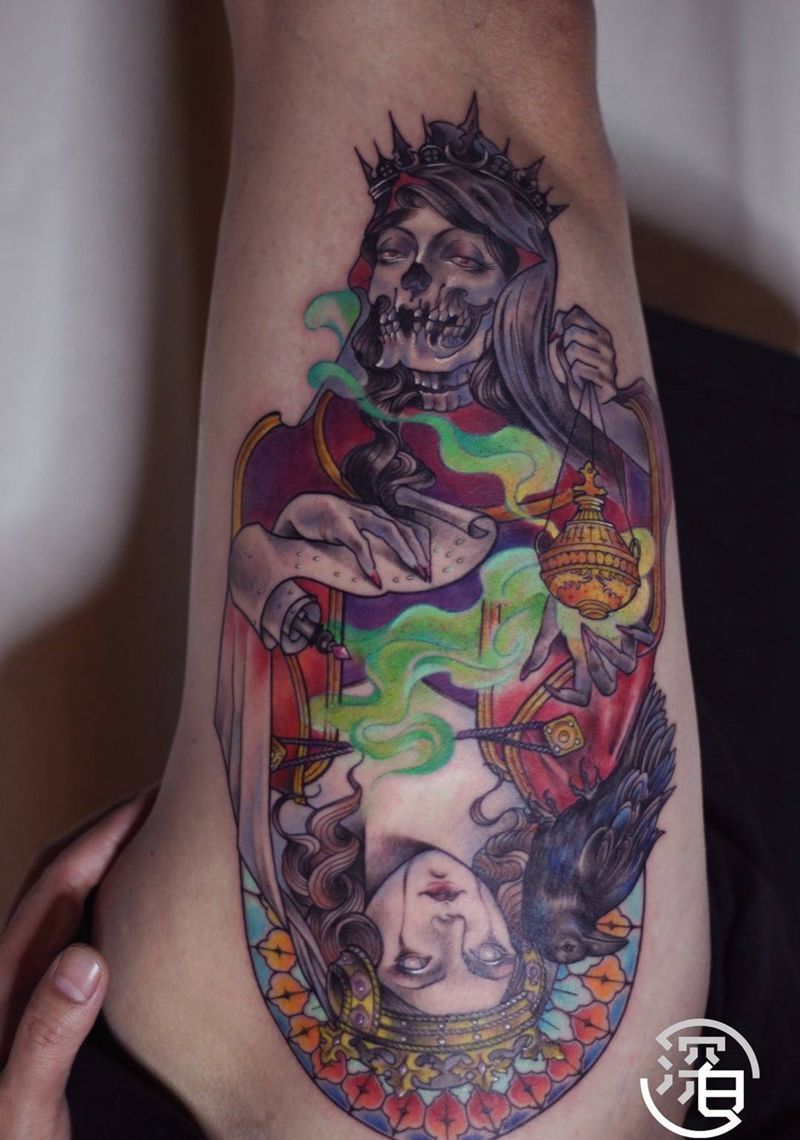 当前位置: 首页 >湖南省长沙市纹身店-深白刺青纹身图案>人性两面纹身图片_腿部New School欧美写实美女骷髅纹身图案